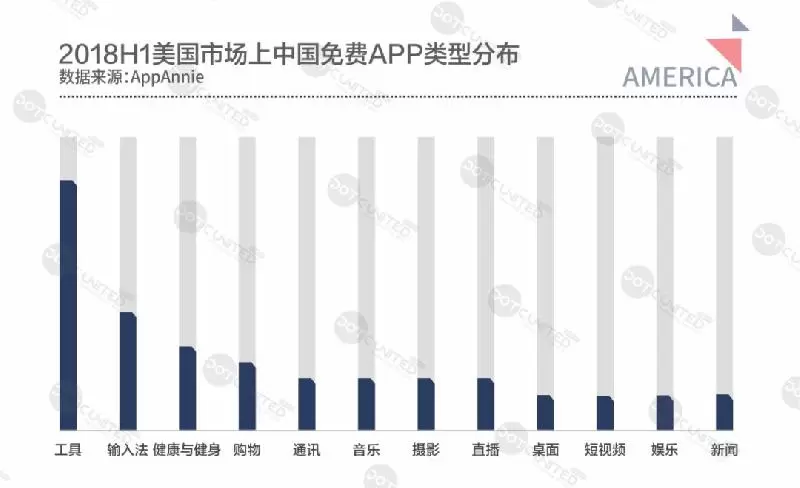 统计2018年上半年美国免费榜TOP500中国APP结果显示,工具类仍然是中国出口美国APP市场最大品类,随着内容风口的到来,工具类产品频繁被各路资本和媒体唱衰,工具类App虽然粘性低、容易被复制,产品同质化严重,但作为刚需产品,工具类产品的市场天花板依旧很高。