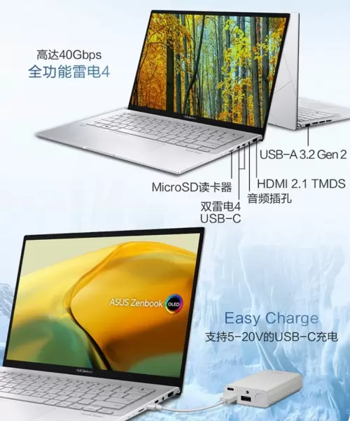 在续航能力上,灵耀14 2023搭载了75Wh超大电池,可连续播放离线1080P视频15小时。拥有全能I/O接口,双雷电4接口提供强大连接力,支持5-20V宽幅电压充电,可以用手机充电器、甚至充电宝为其充电,对于商旅出差族来说可谓是非常方便实用了。