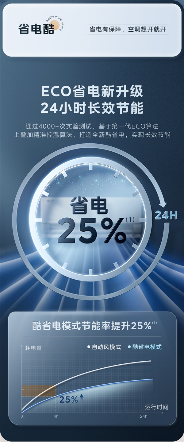 省电作为空调用户长期存在的需求,对于美的空调而言是一个不断超越自我的课题。此前第一代ECO舒省模式为8小时,美的空调经过超4千次反复实验测试,运用精准控温算法使酷省电实现24小时长效节能,节能率提升25%。在节能基础上,酷省电依托美的空调专利金奖技术压缩机高频启动速冷热控制算法,能够自适应宽温域室外环境,将室内温度快速降至舒适的26℃。