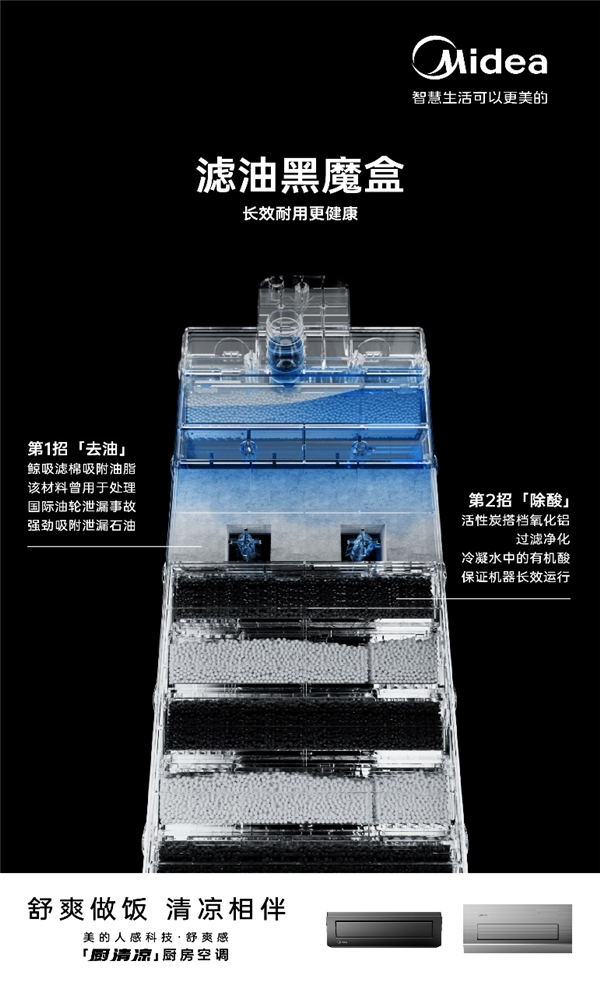 美的厨清凉厨房空调还有一项黑科技——滤油黑魔盒,两层过滤净化保证机器长久的生命力。它首先采用了石油泄漏应急的同款技术——“鲸吸滤棉” 曾在美国墨西哥湾原油泄漏事件中用来吸收邮轮泄露出的原油,美的厨清凉用其实现高效强劲地吸附油脂。其次,滤油黑魔盒在过滤的同时还采用活性炭小分子吸附小分子有机物,有效除酸,防止细菌霉菌滋生堵塞。滤油黑魔盒的双层过滤净化,为厨房空调的长久使用保驾护航。