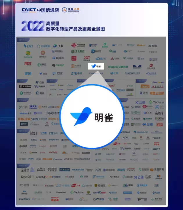大会深度展示了中国信通院在数字化领域的工作成果,全面展望了2023年行业的数字化发展趋势,发布了《高质量数字化转型产品及服务全景图(2022)》,明雀凭借专为甲乙方合作打造的客户协同平台这一全新定位,成功入选全景图“通用办公”及“项目管理”两大核心领域。