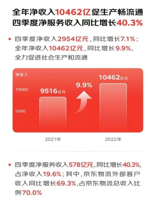 北京时间3月10日,京东集团(纳斯达克股票代码:JD,港交所股票代号:9618)发布了2022年第四季度及全年业绩,2022年第四季度净收入为2954亿元人民币(约428亿美元),同比增长7.1%。2022年第四季度净服务收入为578亿元人民币(约84亿美元),同比增长40.3%。2022年全年净收入为10462亿元人民币(约1,517亿美元),同比增长9.9%。可以看出,2022全年京东携手品牌实现了有质量的增长,完成了降本增效、高质量增长的目标。