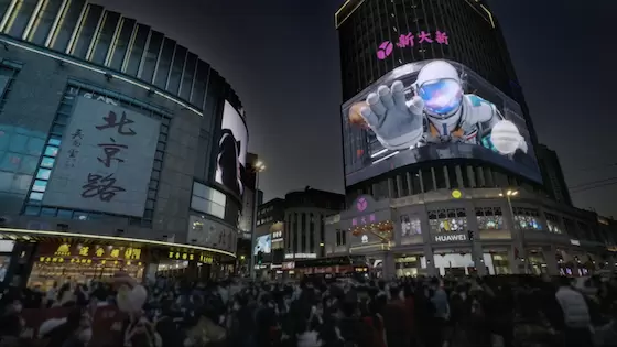 空间站中一艘高科技太空船停留在屏幕前,宇航员将一只巨大的手冲出屏幕和观众互动……广州北京路新大新大厦巨幕中震撼的视觉效果引来路人拍照打卡,驻足观看。日前,这块由4K花园独家运营的国内首块1200㎡8K裸眼3D户外大屏——“8K春天”正式启动,投入商用,这支由4K花园出品、向中国航天精神致敬的最新裸眼3D创意视频,燃爆整个北京路商圈,让更多民众对户外创意充满关注与期待。