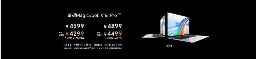 荣耀MagicBook X 16 Pro,i5-13500H/16GB/512GB 售价4599元,首销限定价4299元;i5-13500H/16GB/1TB 售价4899元,首销限定价4499元。