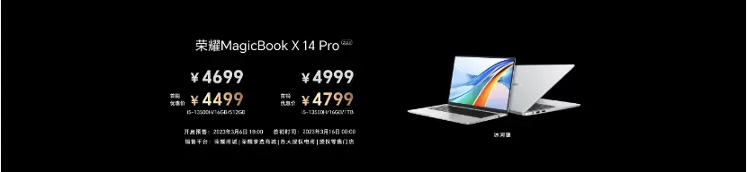 目前,荣耀MagicBook X Pro系列也在火热预售中,并将于3月16日正式开启首销。其中荣耀MagicBook X 14 Pro,i5-13500H/16GB/512GB 售价4699元,首销限定价4499元;i5-13500H/16GB/1TB 售价4999元,首销限定价4799元。