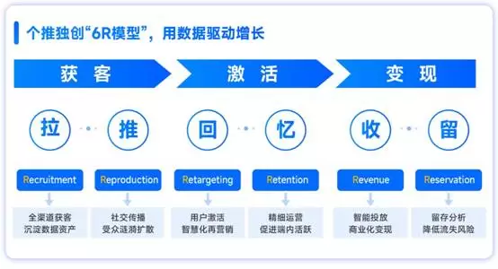 做过运营的同学都知道,实际工作中,用户增长并不是简单的用户数量的增长,而是一个系统化、综合化的工程,不仅需要有数据的支撑,还要有正确的方法论作指导。个推之前推出的"6R"用户增长模型,针对APP不同运营阶段遇到的痛点,为客户提供数智化解决方案和数据工具。基于6R模型,APP自有端内数据和个推数据能力进行打通,用户数据资产实现统一管理,APP用户标签体系被进一步完善,使APP可以对不同运营场景下的用户做更加多维的洞察和有效区分,并结合多元渠道进行精细化触达,促进运营效率和商业收益的双提升。