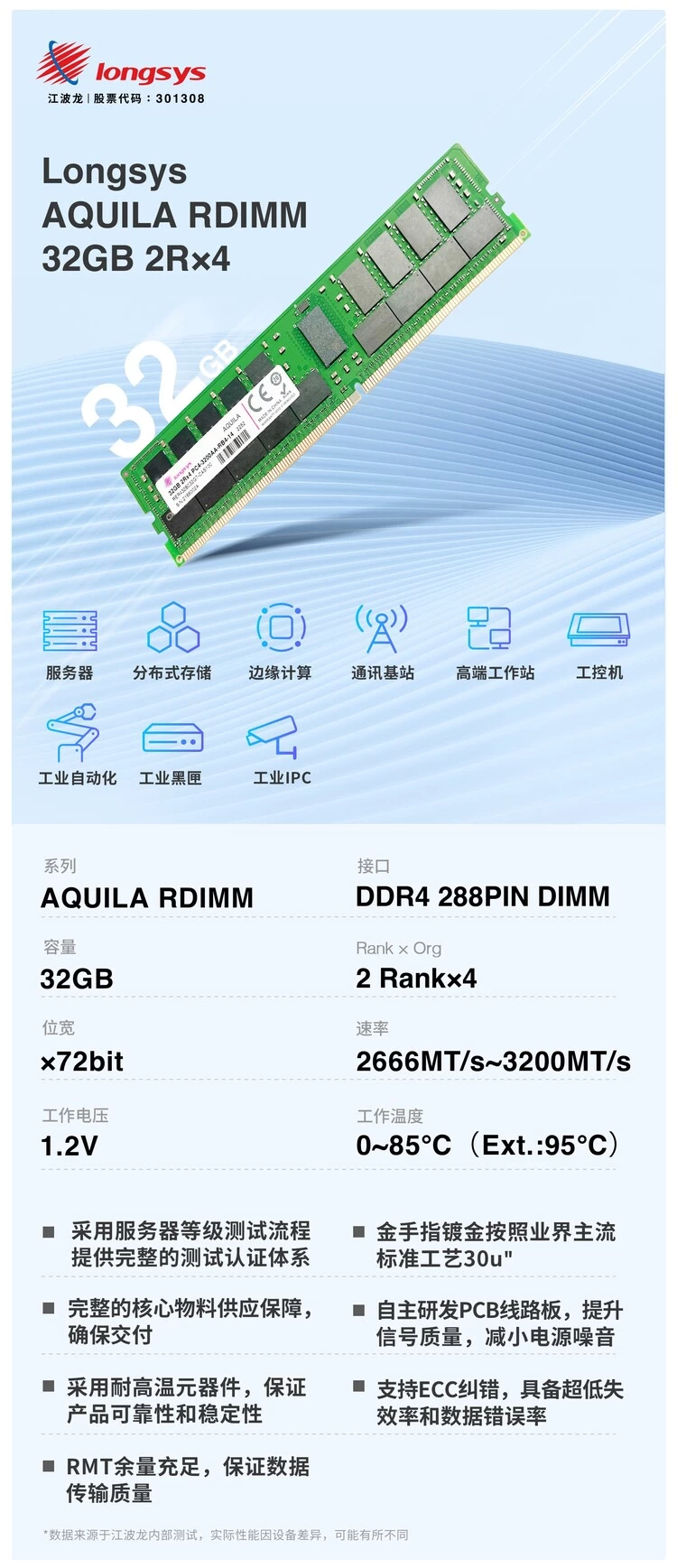 江波龙具备完整、成熟、全链条的存储产品交付体系。Longsys AQUILA RDIMM搭载服务器等级DDR4内存颗粒,并采用江波龙自主知识产权的电路板设计,可有效提升信号质量,减小电源噪音,由国内一线PCB制造商生产。