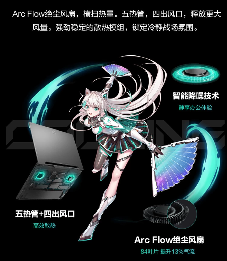 天选4锐龙版搭载了冰川散热系统,拥有双风扇+五热管+四出风口配置,每个Arc Flow绝尘风扇均采用84片扇叶设计,可提升13%的气流量,避免热量堆积;A面采用梯形切割,出风口无遮挡设计,散热能效可提升约25%,长时间高负载运行依旧流畅稳定,时刻提供澎湃性能释放。天选4锐龙版还有三种不同散热模式,FN+F5快捷键即可轻松切换,增强模式下提供强悍性能,性能模式下满足日常使用需求,安静模式下可有效减少噪音,结合智能降噪技术,可为用户打造安静专注的游戏办公环境。