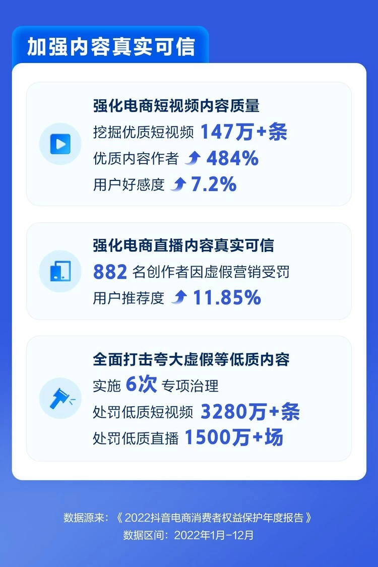抖音电商通过明确内容创作的价值导向、质量标准及判断方式,帮扶真实可信、专业有趣的优质内容,打击夸大虚假、粗制滥造的低质内容,消费者好感度和满意度均有较大提升。