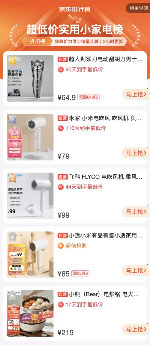 以上为大家推荐的小家电好物,不但满足了不同家庭场景所需,价格也是相当实在,不仅如此,在京东超低价实用小家电排行榜中还有众多小家电好物等待你选购,榜单按照降价力度与销量每2小时更新,如果你想入手一款合适的小家电产品,那一定要关注榜单信息,可别错过心仪好物哦。