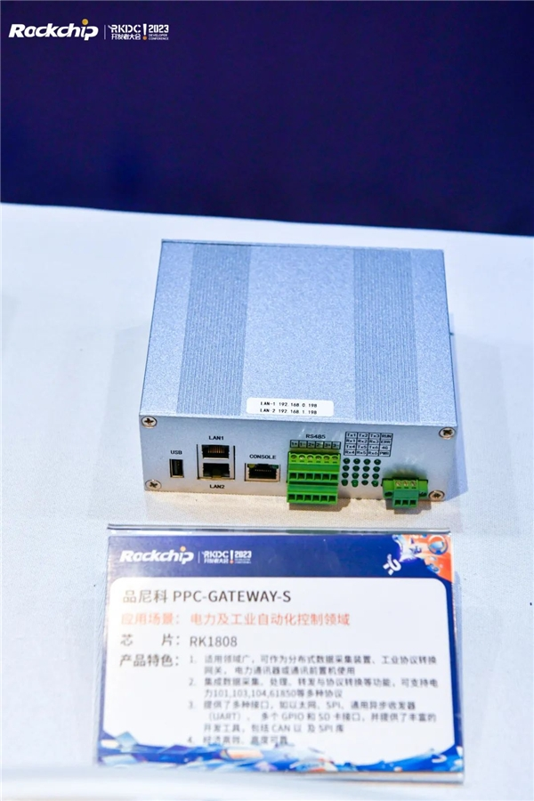 同时,现场展出了一款是适用于电力及工业自动化控制领域的品尼科网关产品PPC-GATEWAY-S,采用RK1808芯片,可作为分布式数据采集装置、工业协议转换网关,电力通讯器或通讯前置机使用;提供了多种接口,如以太网、SPI、通用异步收发器(UART)、多个GPIO和SD卡接口,并提供丰富的开发工具,包括CAN以及SPI库。