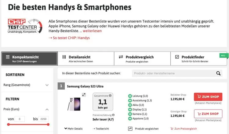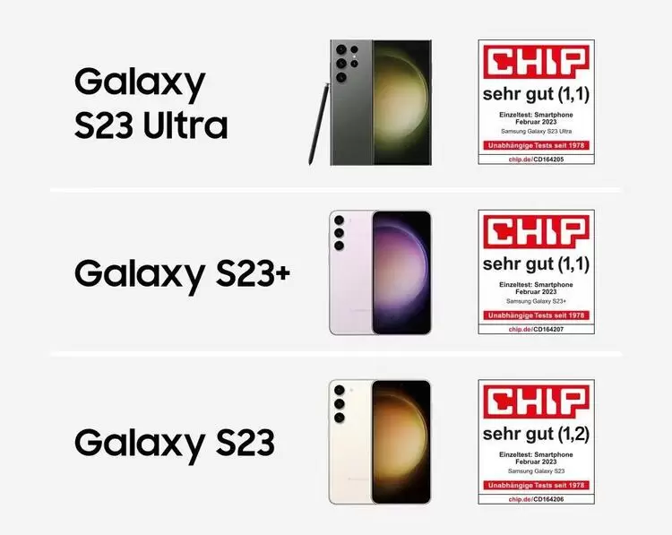 《CHIP》是德国最大的科技媒体, 并且还是全欧洲乃至全球最著名的中立IT产品测试机构之一,其全球测试中心由分布在欧洲和亚洲的18个实验室组成。对于智能手机品类,《CHIP》的测试维度主要围绕性能、显示、电池、相机、设备连接和应用程序商店六大类别,最高评定等级为1.0。经过《CHIP》的测试,三星Galaxy S23 Ultra、Galaxy S23+和Galaxy S23三款产品凭借丰富的创新科技和出众表现取得了前所未有的好成绩,稳稳占据了榜单的前三名。
