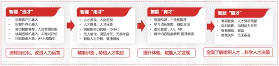 对于企业而言,人才是企业生存和发展的根本,如何发现、使用、培养、留住优秀人才是所有企业人力资源管理的关键,围绕人才的“选用育留”,智能技术可以嵌入人力资源管理的各个环节,基于智能招聘机器人、人才发现、人才画像、离职预测等智能化服务,实现日常人力工作流程的自动化,提升人力运营效果和员工体验;精准识别和发现和培养人才,保障持续的人才供应,赋能人才建设和发展;全面了解组织和员工,基于数据做出科学的人才决策。