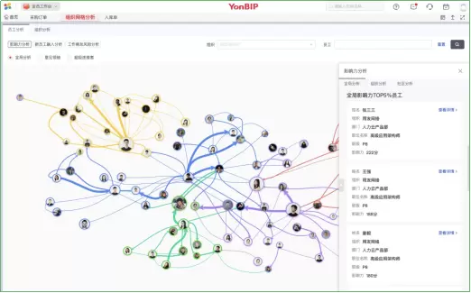 用友BIP组织影响力网络(ONA)突破传统根状组织框架,通过社交网络与深度学习构造的“负责任AI-SaaS”,开箱即用地提供可变的员工价值洞察创新。通过职场社交协作数据链的扁平化挖掘,确定核心角色、发现意见领袖、诊断组织健康度、推动跨职能地域和专业领域的协作模式......,全视角实现人力资源价值洞察,更大限度释放高度不确定环境下的组织效能。