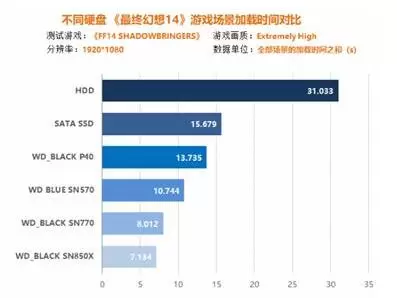 这里我们分别测试了6种存储设备,分别是HDD(与传统移动硬盘成绩接近)、SATA SSD,PCIe 3.0 SSD(WD Blue SN570)、PCIe 4.0 SSD(WD_BLACK SN770)与旗舰级PCIe 4.0 SSD(WD_BLACK SN850X)、以及移动固态硬盘(WD_BLACK P40)的实际游戏场景加载时间,通过对比加载速度来看看这些存储设备间的性能差距。