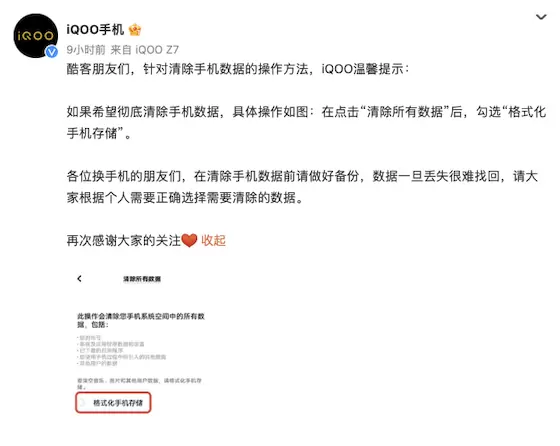 iQOO回应难以删除数据问题,发布教程提醒用户勾选格式化