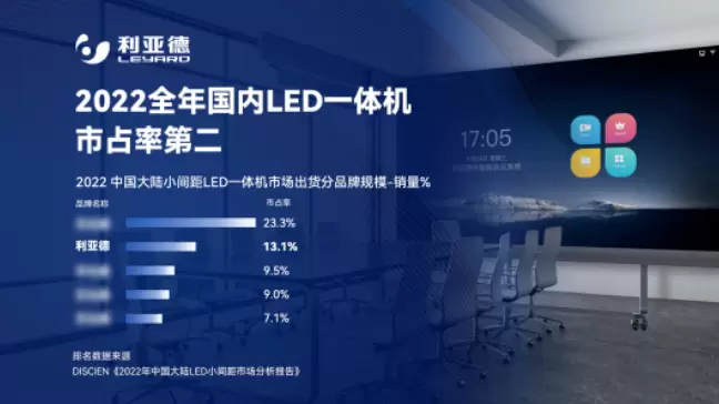 近日,奥维云网、DISCIEN相继发布《中国大陆小间距LED市场研究报告》《2022年中国大陆LED小间距市场分析报告》。报告显示,利亚德LED一体机销量及销售额逐年上升,皆位居行业第二位。
