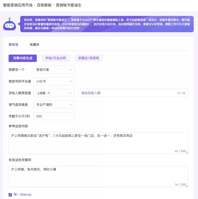 为了更好地解决内容策划难题,营销秘书爱迪生结合ChatGPT的文本生成优势,提供创意内容生成的功能,自动生成高质量、多样化的营销文案,为营销人员的内容创作工作提供新鲜灵感与思路。