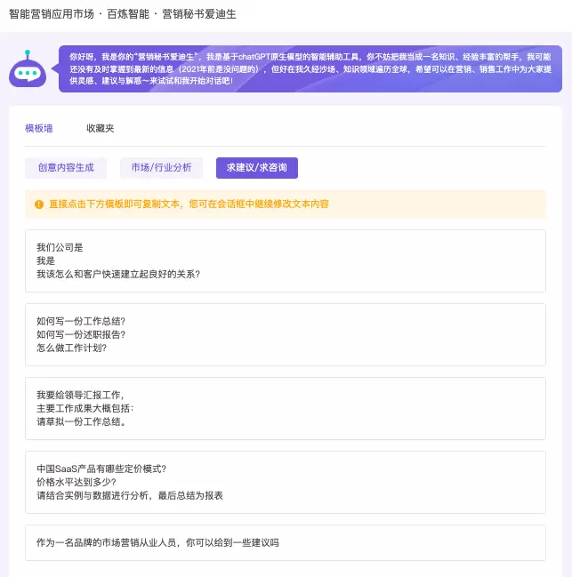 营销秘书爱迪生将提供的问题咨询/营销建议功能,就像一位私人导师,可以根据用户的具体需求,在营销获客、市场研究、工作成长等维度上提供实用的建议,让用户获得职业技能的充分提升。