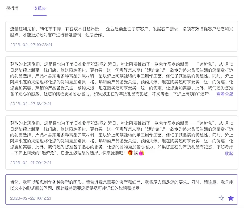 除了以上3大功能外,营销秘书爱迪生还搭建了收藏夹专区,方便用户将满意的答案收藏起来,灵活查看,构建专属于自己的知识库。