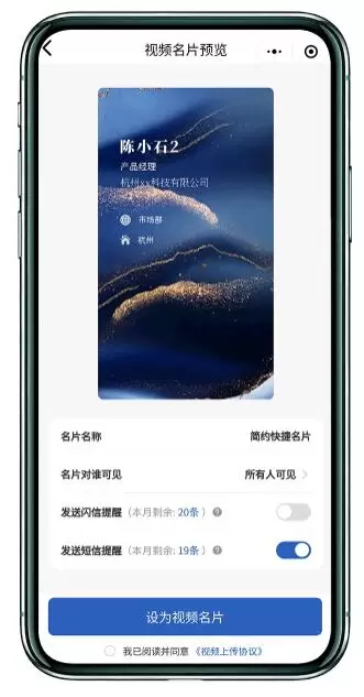 你所想要的名片DIY模板全在这里——“5G视频名片”小程序。小程序的“名片广场”目前已汇集海量多元类型模板,如商务名片、生肖星座、个性签名、节日节气以及温馨家庭等,能够满足校园师生、职场白领、亲友家庭等各圈层用户“个性化定制”需求。