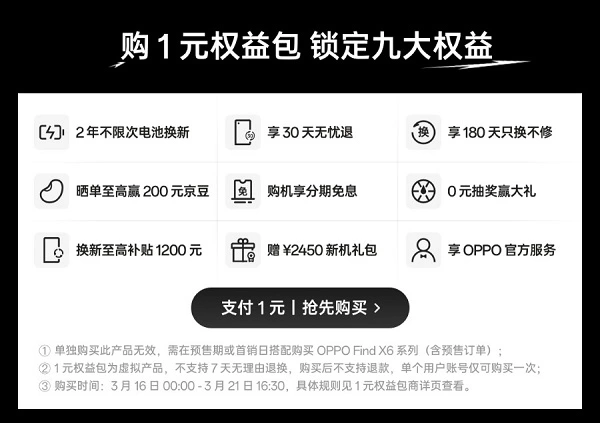 针对此次即将发布的OPPO Find X6系列新机,京东手机“先人一步”也推出九大超值权益。3月16日0点至新品发布前,消费者可以限量购1元权益包,提前锁定包括2年不限次电池换新、30天无忧退、享180天只换不修、晒单至高赢200元京豆、购机享分期免息、0元抽奖赢大礼、换新至高补贴1200元、赠价值2450元新机礼包、享OPPO官方服务在内的九大权益,焕新更超值。