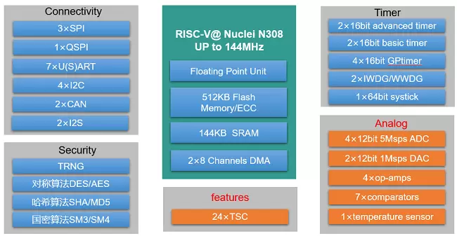 CM32M433R系列芯片采用 32 bit RISC-V N308内核,最高工作主频144MHz,支持浮点运算和DSP指令,集成多达512KB Flash、144KB SRAM、4x12bit 5Msps ADC、4xOPAMP、7xCOMP、2x1Msps 12bitDAC,支持多达24通道电容式触摸按键,集成多路U(S)ART、I2C、SPI、QSPI、CAN通信接口,内置密码算法硬件加速引擎2.0B,支持多种国际及国密算法硬件加速。