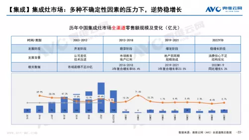 据奥维云网(AVC)全渠道推总数据显示,2022年1-9月集成灶零售额规模为190亿元,零售额同比增