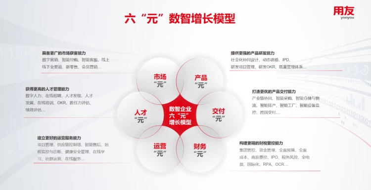 六“元”数智增长模型涵盖了产品、交付、市场、财务、人才和运营六个方面。它可以帮助企业在每一个方面实现数智化转型,提高效率,降低成本,增强企业竞争力。同时,数智飞轮是指用友YonSuite涵盖的56个全场景数智化场景,可以帮助企业快速实现全面数智化转型,形成“飞轮效应”,快速实现高效增长。