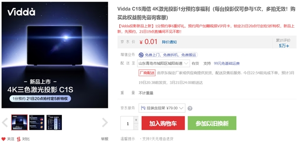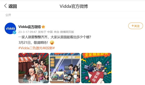 据了解,海信旗下年轻品牌Vidda即将于3月21日推出其三色激光投影新品Vidda C1S,参照此前Vidda C1,新品还将采用海信在行业内领先的三色激光技术,从而进一步奠定其旗舰投影的行业地位。
