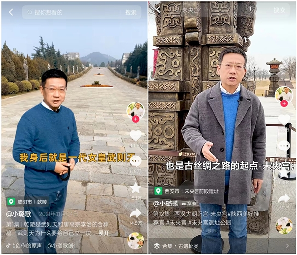 “当我沿着宽阔的司马道一直往上走的时候,我仿佛感觉女皇武则天和唐高宗李治就坐在那高高的山梁上,而我就像是一个前来朝见的使者。”画面中,一个身穿蓝色针织衫和牛仔裤的中年男人,正在为大家介绍乾陵。他就是杨汶锦,一位从IT行业转行到短视频的历史文化创作者。自2020年入驻抖音以来,杨汶锦带大家浏览了乾陵、未央宫等历史古迹,往往用十分钟讲述一个朝代、一个历史人物的丰功伟绩,或在一处古迹前讲述一段鲜为人知的历史,让不少人对历史文化知识产生了兴趣,甚至有老师向他询要视频希望用于教学辅助,也有老师邀请他去学校做讲座。