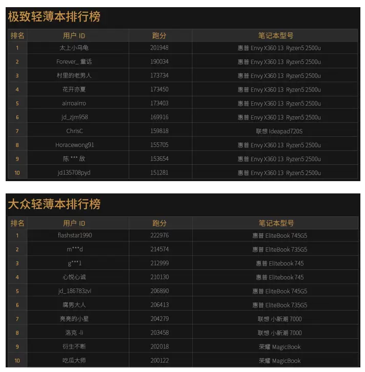 在刚刚结束的2018京东超轻薄笔记本挑战赛当中,京东ID为 “太上小乌龟”的用户在极致轻薄本组当中以201948的总分获得冠军,将价值3000元的E卡收入囊中,而帮助他获得这一傲人成绩的不是别人,正是采用AMD锐龙5 2500U移动处理器的HP Envy x360 13超轻薄笔记本。这款产品的首发价格仅为4999元,去掉3000元E卡,等于不到2000块就买到了一台翻转触屏四核超轻薄笔记本,简直让人羡慕,只恨自己当初没选锐龙本。而大众轻薄本组的冠军则被京东ID为“flashstar1990”的用户斩获,他采用惠普Elitebook 745G5跑出了222976分的成绩,这款产品配备了AMD最新的锐龙7 PRO 2700U,和超轻薄组的冠军机型Envy x360 13一样,这款EliteBook 745 G5同样没有配备独显,但性能一点都不弱。
