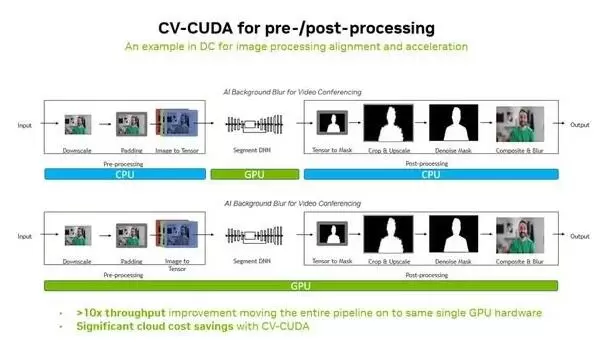 另外,CV-CUDA 开源库是一个通用的高性能图像处理加速库,适用于不同行业的 AI 成像前后处理,目前已经被短视频行业、自动驾驶行业和地图行业等多个领域广泛采用。仅就前处理而言,就可以减少训练和预测中调试工作量,提升模型对齐效果,提升工作效率。