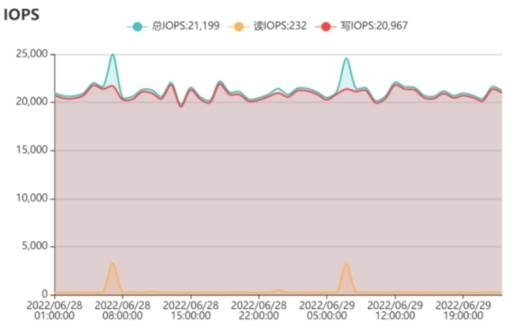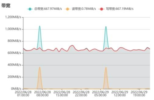 图2,图3为某70个节点的存储集群升级前、升级中以及升级后的IOPS、带宽性能曲线图。存储集群在线升级时间为2022/06/29 01:00 – 02:00执行在线升级,在线升级期间IOPS、带宽性能与升级前、后保持一致并未有下降,仍维持在正常水平。