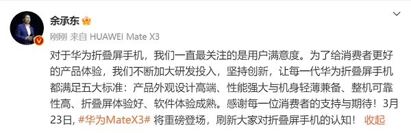 3月21日,华为终端BG CEO余承东发布了一条微博,阐述了华为折叠屏手机的五大标准,即从产品外观、性能与轻薄机身、可靠性、折叠大屏和软件体验五个方面强调了一定要做到的标准,而这五个方面也正是折叠屏手机被用户长期诟病的痛点问题,余承东此举意味着即将发布的华为Mate X3将在这五个方面带来极大的升级和创新,或将折叠屏手机的使用体验推至新的高度。
