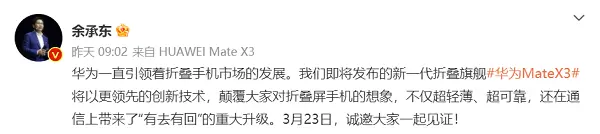 华为通过对折叠屏手机未来的思考和预判,创新探索,不断突破,成为持续领跑的开创者、行业规范的制定者,奠定折叠屏手机市场的新格局。你觉得华为Mate X3将带来怎样的轻薄设计和用户体验?哪些创新功能将会打动你?3月23日,我们共同期待华为Mate X3的发布!