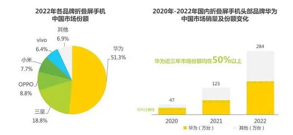 近日,艾瑞咨询研究院发布了《2023年中国折叠屏手机市场洞察报告》,数据显示,2022年华为折叠屏手机的市场份额达到了51.3%,占据了国内折叠屏市场的半壁江山,同时连续三年位居国内折叠屏市场榜首。这个数据意味着,中国每两台折叠屏手机就有一台是华为品牌,通过多年耕耘,华为折叠机已经牢牢树立起了高端、优质的形象,并以极高的用户认可度赢得了市场。