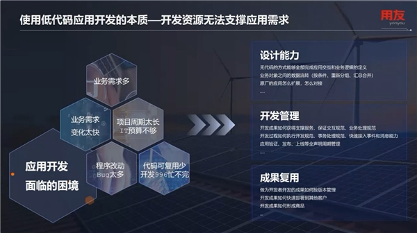 在业务应用方面,肖培明提出,为了管理开发过程,需要制定规范并将其注入到每个阶段的成果中,以管理和提升开发产能。同时,这些规范也可以在企业和行业之间进行复制,从而大规模提升应用的响应能力。