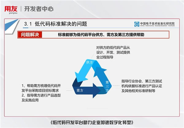随着科学技术的不断进步,低代码开发平台需求越来越大,仅靠使用者的有限知识和条件,很难判断产品能力是否达标,由中国电子技术标准化研究院牵头的《低代码开发平台能力要求》(标准号:T/CESA 1239-2022)团体标准的正式发布,为需方选择产品时提供了科学的指导。用友作为重要参编单位参与标准撰写。