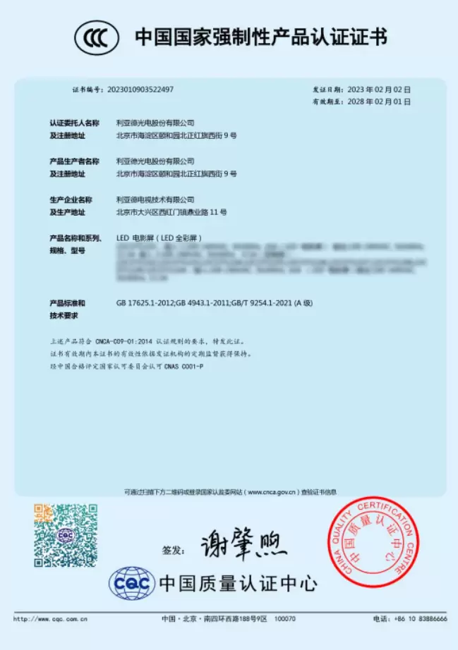 众所周知,DCI是目前国际通用的数字影院系统认证标准。受该规范限制,未获得DCI认证的数字电影系统或产品无法在电影市场上进行应用推广。2022年10月,利亚德拥有完全自主知识产权的LED电影屏获得好莱坞DCI认证。基于此,利亚德布局影院市场的脚步,再进一步。而通过中国国家强制性产品认证、中央宣传部电影技术质量检测,则意味着利亚德将在国内数字影院市场开启新的篇章。