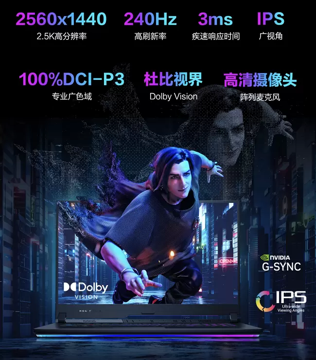 魔霸7 Plus超能版的屏幕集高清、高刷、广色域等多项优势于一体,拥有17.3英寸广阔视野,具备2.5K高分辨率、240Hz刷新率以及 G-SYNC防撕裂技术,响应时间仅有3ms,有效避免游戏画面拖影、撕裂现象,同时支持杜比视界以及100% DCI-P3广色域覆盖,3A大作的每个细节都能生动展现,为玩家提供极佳的大屏畅玩体验。