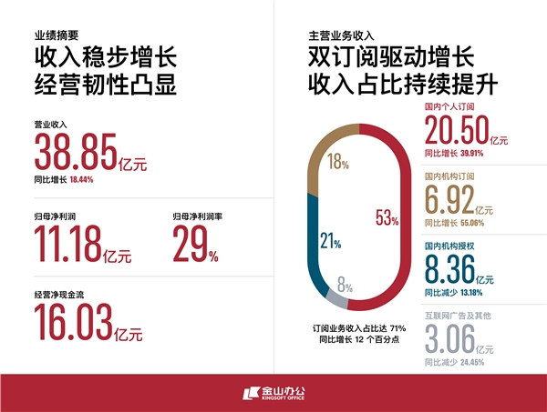 3月21日晚间,金山办公正式公布了2022年报数据。2022年,金山办公营收与净利润实现双增长,营业收入38.85亿元,同比增长18.44%;归属于母公司所有者净利润11.18亿元,同比增长7.33%;归属于母公司所有者扣除非经常性损益净利润9.39亿元,同比增长11.71%,盈利能力持续提升。