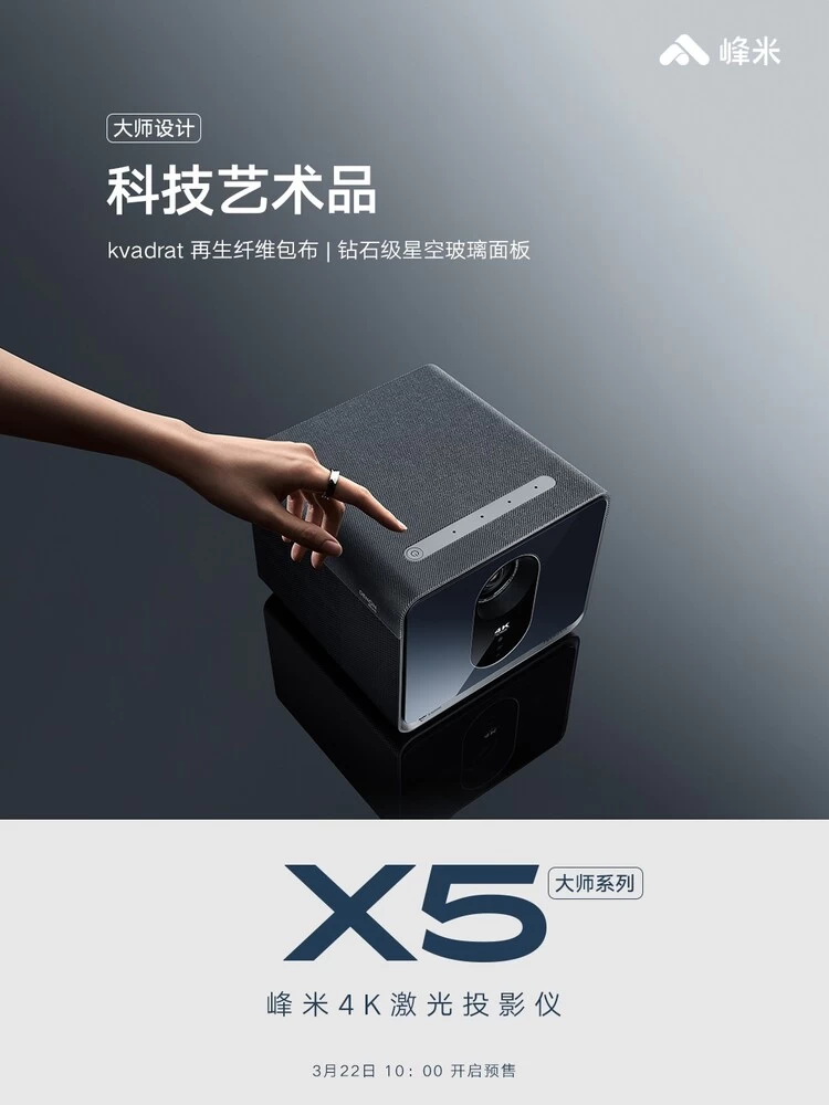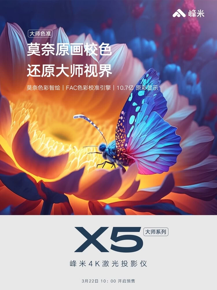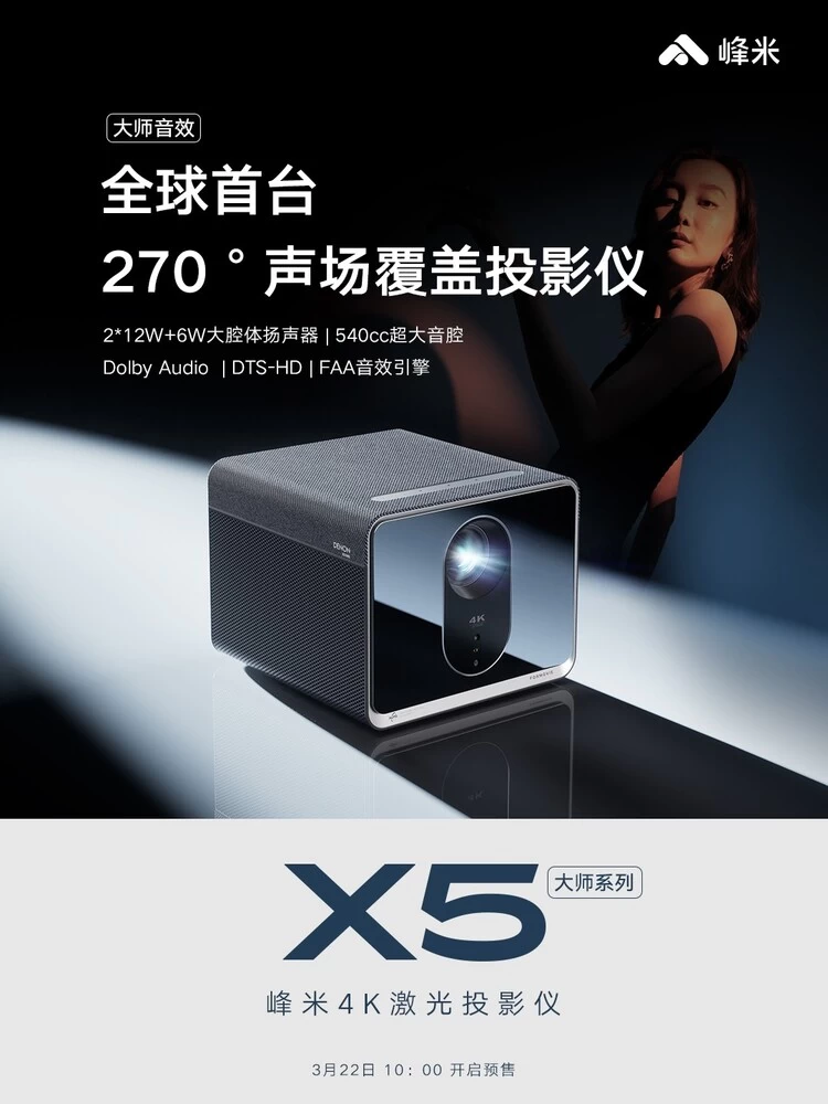 与此同时,峰米也将积极推动投影行业进入亮度标准化阶段,拒绝亮度虚标,在全面保护消费者的前提下,峰米大师系列两款产品推动投影行业健康发展。3月22日早上10点,峰米X5已在天猫、京东、小米有品、抖音、峰米线下零售店等多家渠道开启预售,欢迎各位消费者前往选购,体验激光投影划时代产品。