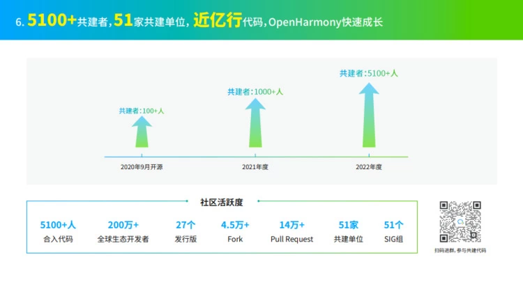截至目前,OpenHarmony共有超过5100名共建者,51家共建单位,200多万名全球生态开发者,产出近亿行代码。