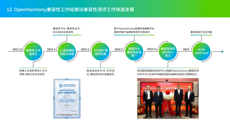 此外,为了保障OpenHarmony生态应用和硬件设备的兼容性,OpenHarmony兼容性工作组正式成立,2022年工作组不仅推动完成超过220款产品的兼容性测评,还成立了首个金融垂类的兼容性测评合作中心,推动OpenHarmony兼容性测评工作快速发展。