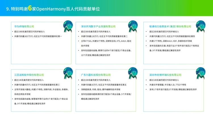 2022年7月,在开放原子全球开源峰会上,开放原子开源基金会秘书长发布《OpenHarmony共建地图1.0》,51家单位投入建设代码。其中,华为、深开鸿、软通动力、润和软件、九联科技和优博终端六家单位持续投入人力参与代码共建,每家均有超过100位开发者提交代码,成为“OpenHarmony百人代码贡献单位”。