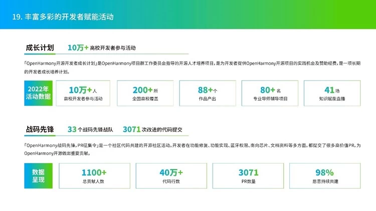 此外,OpenHarmony还专门针对开发者发起和举办了「OpenHarmony开源开发者成长计划」、「OpenHarmony战码先锋,PR征集令」等活动,旨在赋能开源开发者实现个人能力提升。截至2022年12月31日,「OpenHarmony开源开发者成长计划」活动共发布2场赛事,产出88个优秀作品,覆盖200多所高校,累计有超过10万名开发者参与。「OpenHarmony战码先锋,PR征集令」活动则吸引1500+开发者参与开源共建,提交PR数3071个,诞生1100+个Contributors。
