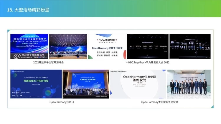 其中,OpenHarmony生态使能签约仪式、OpenHarmony技术日、2022开放原子全球开源峰会—OpenHarmony分论坛等大型活动的举办,为合作伙伴、开发者、高校等各方搭建了一个交流沟通的平台,传递了OpenHarmony的技术和生态进展,极大提升了OpenHarmony的行业影响力。