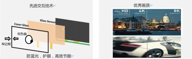 技术方面, TCL商用背靠TCL大平台,拥有强大的技术研发能力和资源,并在先进交互、显示、健康环保、工业设计等领域做出了全方位的布局。如交互领域,TCL商用积极布局纯平红外、G-sensor电容、P-CAP、In cell触控、Touch On POL以及激光触控技术,这些技术未来都将为用户体验带来质的飞跃。在显示方面,TCL商用在0贴合技术、分辨率,高刷新率和色域上追求极致,以应对高画质要求的场景,如医疗专显、高端展览展示。
