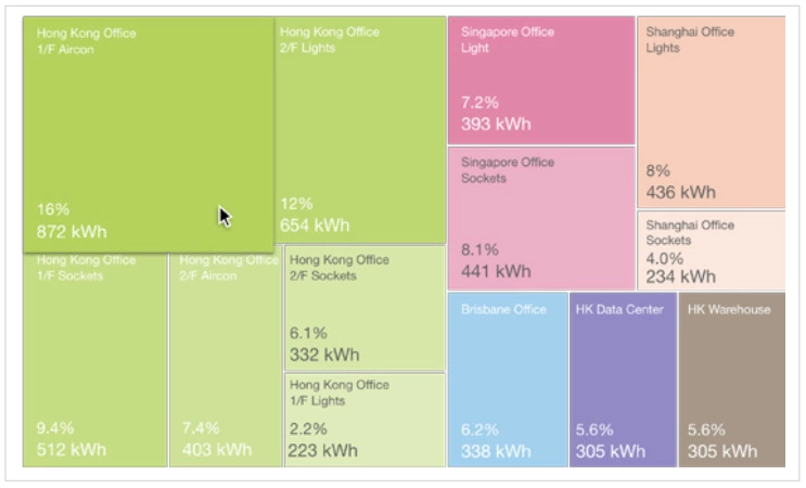 空间维度:找出哪一栋楼、办公室或者用电类别正在消耗最多的能源。如下图: